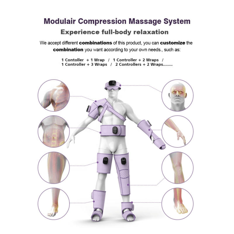 Detachable Full Body Massager Proprietary universal controller – 1 controller for all parts. Customizable compression massage system * 3 levels of ultra-soothing heat * 4 massage program *5 intensity levels * Cordless & portable * Reduced inflammation We accept different combinations of this product, you can customize the combination you want according to your own needs., such as: 1 Contoller + 1 Wrap 1 Controller + 2 Wraps 1 Controller + 3 Wraps 2 Controllers + 2 Wraps …….. | |