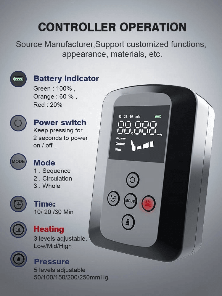 Benefits of Compression Boots: Relaxation and Vitality: Promotes leg relaxation and boosts energy levels . Enhanced Sports Performance: Improves muscular flexibility and aids in recovery . Rehabilitation Support: Hands-free tools for muscle strain recovery . Reduces Swelling: Alleviates lymphatic swelling, prevents varicose veins, and reduces leg cramps. Promotes Circulation: Accelerates vein and lymphatic flow, enhances circulation, and boosts metabolism. Compression Boots With Heat | ![]() |